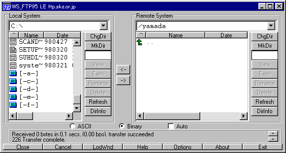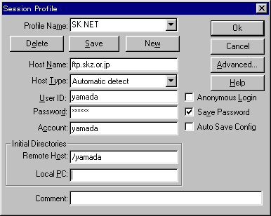 | ・Remote Host: | SK NET から発行されたログイン ID の前に 『/』( 半角スラッシュ ) を付けたものを記入。( 例:/yamada ) |